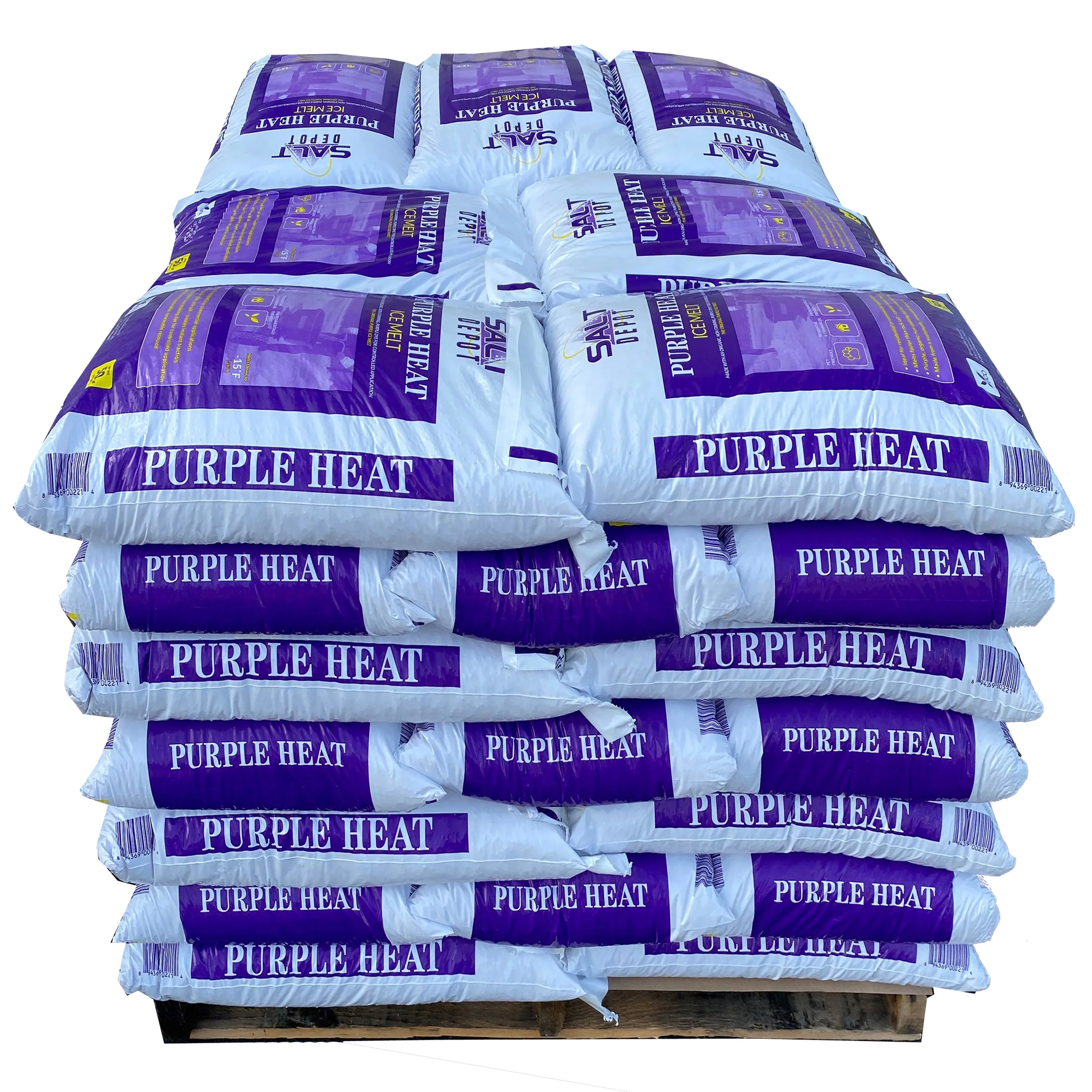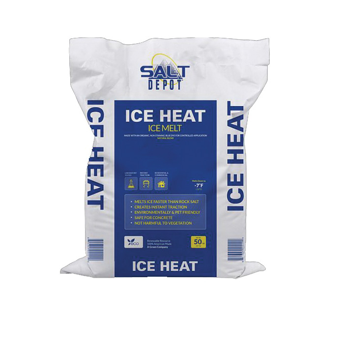 Ice Heat is coarse solar salt naturally enhanced with calcium, magnesium and potassium chlorides. It will melt down to -7ºF / -22ºC and contains a blue, organic, non staining dye for controlled application.